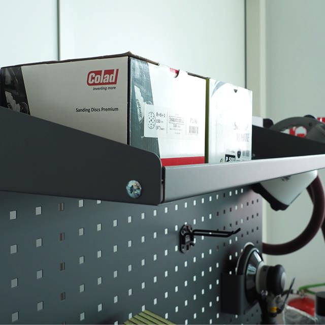 The wall panel is used to organise workstations and serves as a stable mounting surface for accessories, brackets and workshop components. It is particularly suitable for professional paint and bodywork workshops, where order, efficiency and hygiene are crucial.