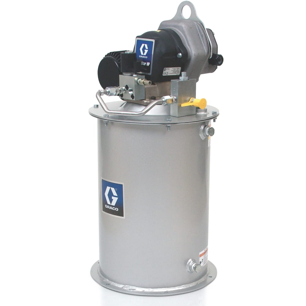 Dyna-Star® HP 24 VDC electric inlet manifold module with pump, pipe-in-pipe, relief valve, follower plate, LL kit, cover, 90 lb (41 kg) tank. CONTAINER