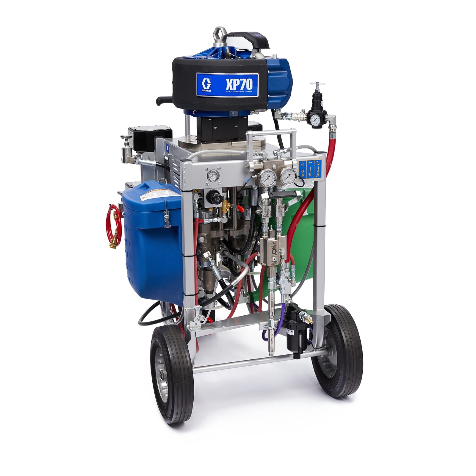 Two-component spraying - simple and affordable The Graco XP70 multi-component sprayer is designed to pump, mix and atomise high solids (up to 100%) coatings with superior results. In addition, the XP70 is designed to be flow fed, eliminating the need for feed pumps and reducing costs. When switching from manual mixing, you will quickly realise that the XP70 offers an excellent return on investment by reducing material waste and using less solvent during cleaning. Flexible options for mix ratio, pressure and flow rate: Choose the system best suited to your application. If you occasionally change materials, Graco XP sprayers are the right choice. This is because you can easily change the mixing ratio by replacing one or both lower pumps. Available in mixing ratios of 1:1, 1.5:1, 2:1, 2.5:1, 3:1 and 4:1.
