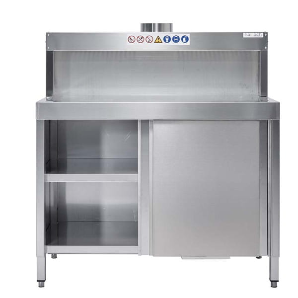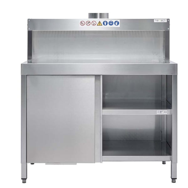 Stainless steel workbench with extractor hoods. Available in two sizes (120 cm and 180 cm) and with or without doors.