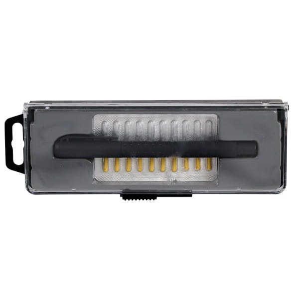 1 x Plastikstift, 1 x Blisterverpackung mit 10 Ersatznadeln, 1 x Schachtel mit transparentem Deckel
