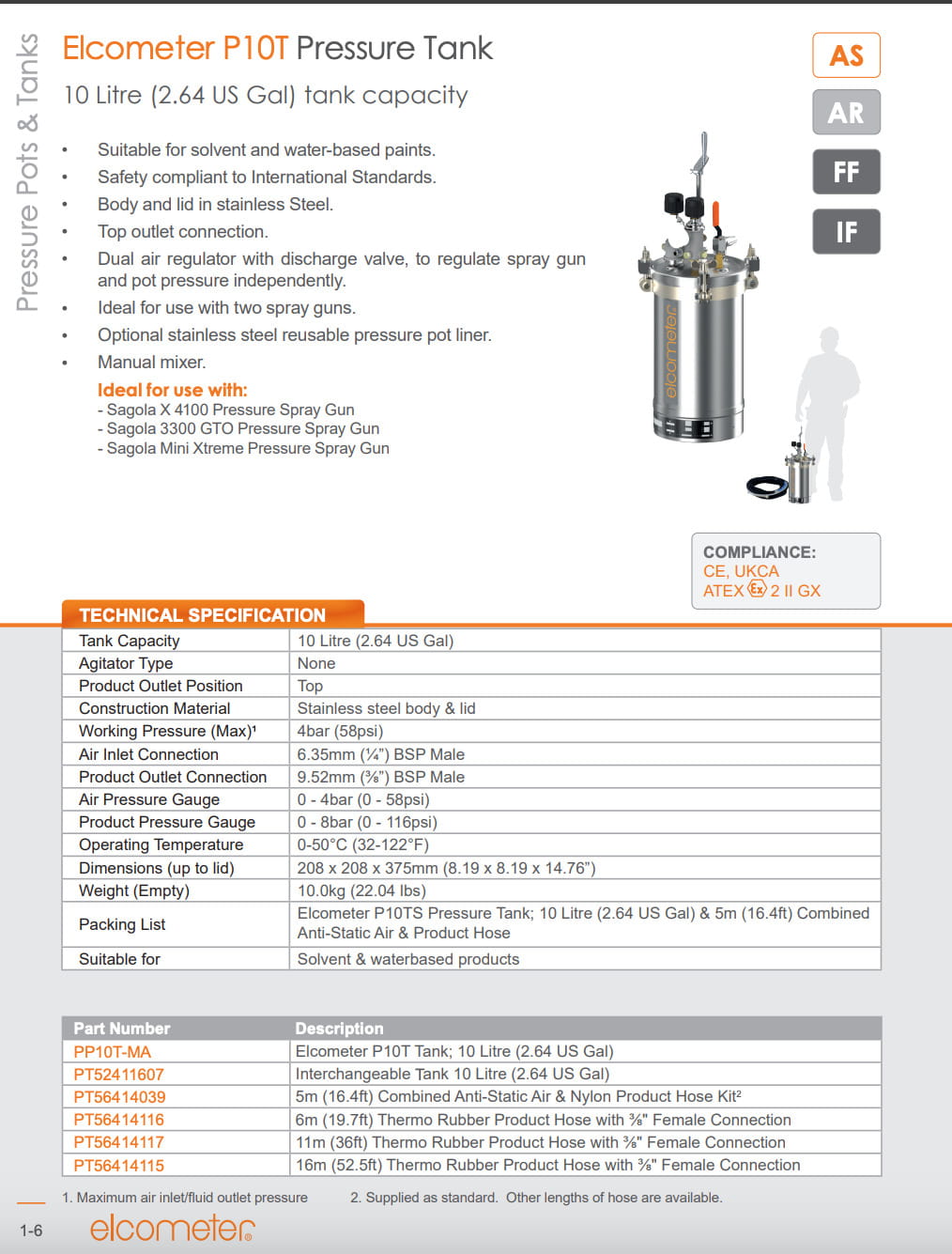 Salida de tanque a presión Elcometer P10TS de 10 l (2,64 galones estadounidenses) y manguera de goma térmica con conexión roscada hembra de 3/8": 11 m (36 pies)