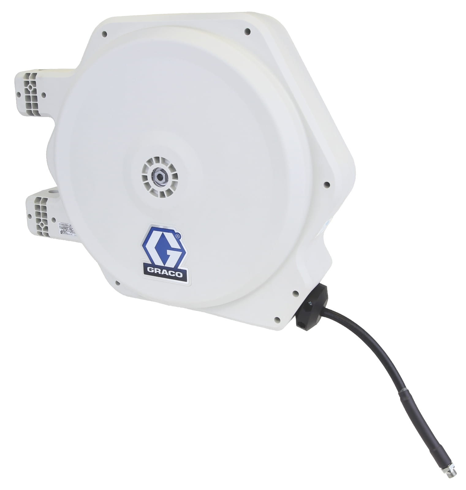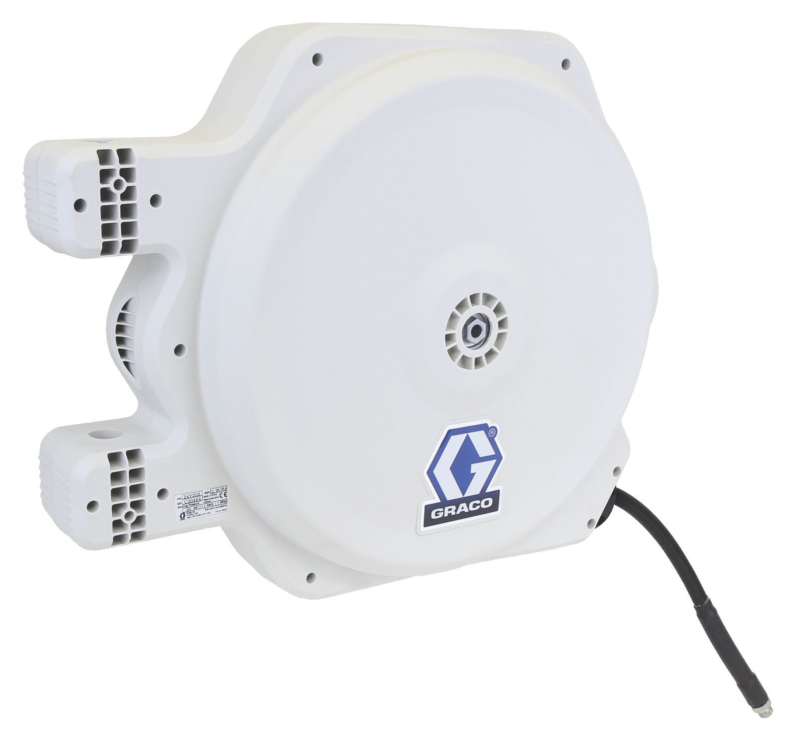 Los enrolladores de manguera cerrados de una sola pieza de Graco garantizan el orden y la seguridad en el lugar de trabajo.
