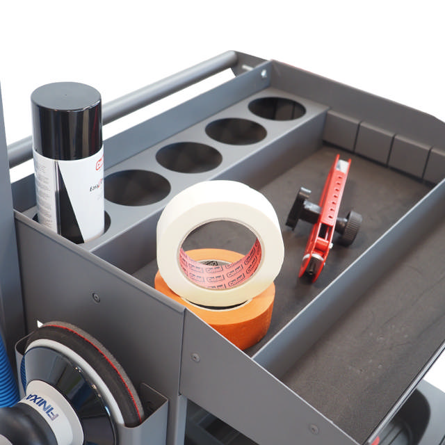 Il portabombolette si monta direttamente sul carrello di levigatura Colad piccolo e offre spazio per un massimo di cinque bombolette spray. In questo modo, i prodotti di uso frequente come spray di controllo, detergenti o primer sono sempre a portata di mano sul posto di lavoro.