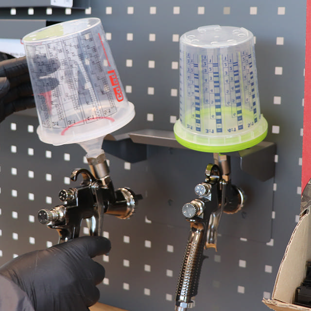 Il supporto viene agganciato a un pannello a parete compatibile o a un sistema a griglia e offre un alloggiamento stabile per due pistole a spruzzo. Grazie al suo design universale, è adatto a quasi tutte le pistole in commercio e favorisce un'organizzazione pulita ed efficiente dell'area di lavoro.