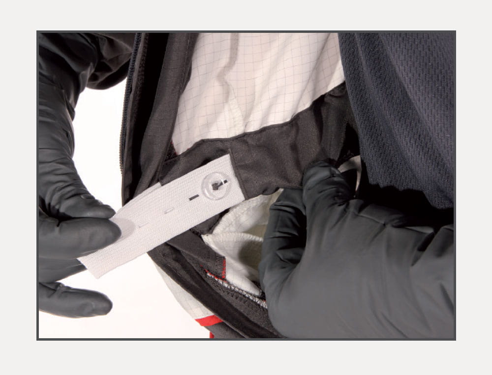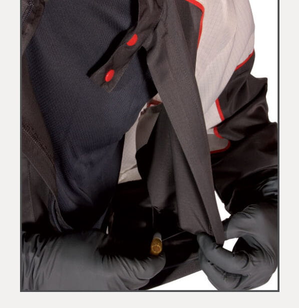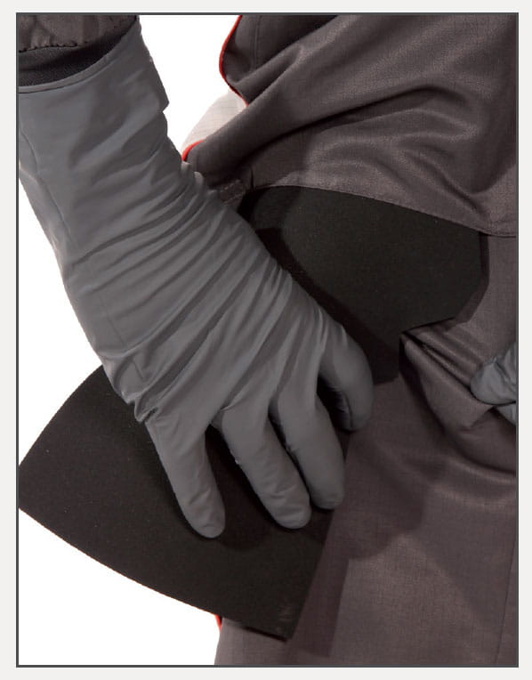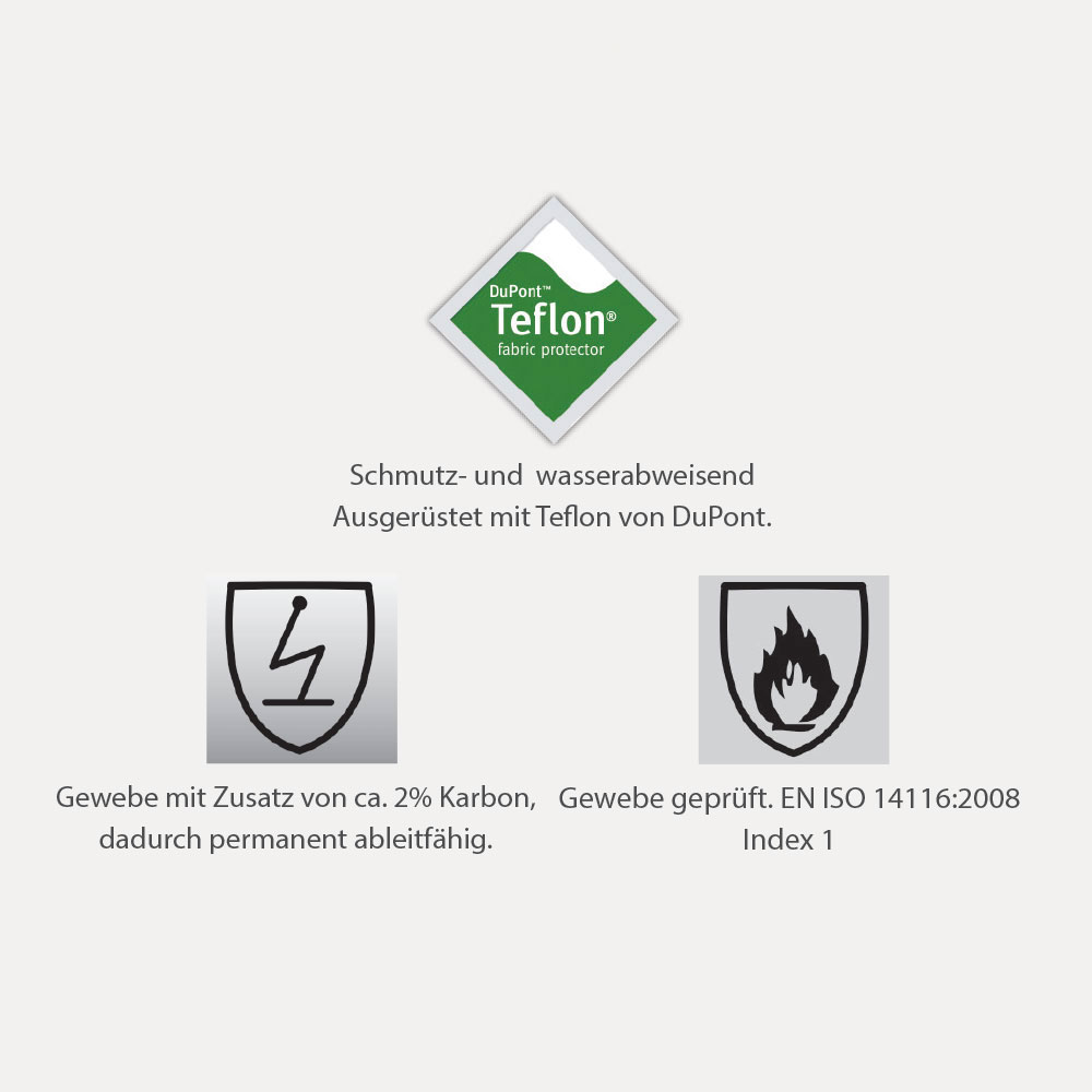 Tessuto con circa il 2% di carbonio, permanentemente conduttivo, repellente allo sporco e all'acqua grazie al trattamento in Teflon®. Cuciture nel sistema BOUND SEAM per una maggiore resistenza.