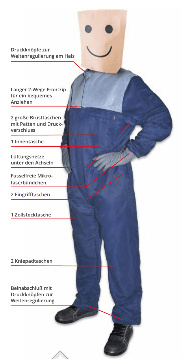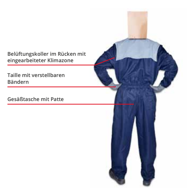 La tuta "SAFETY BLUE" è una tuta elegante dal taglio classico che, proprio come la tuta "SAFETY neo", colpisce per la sua traspirabilità, comodità e piacevolezza quando indossata.