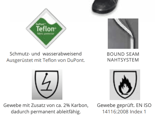 Il tessuto è composto da filamenti di poliestere che non lasciano pelucchi, nei quali è incorporato un FILATO DI CARBONIO per dissipare in modo affidabile le cariche elettriche. Inoltre, la tuta è dotata di un trattamento in TEFLON che respinge lo sporco e l'acqua.