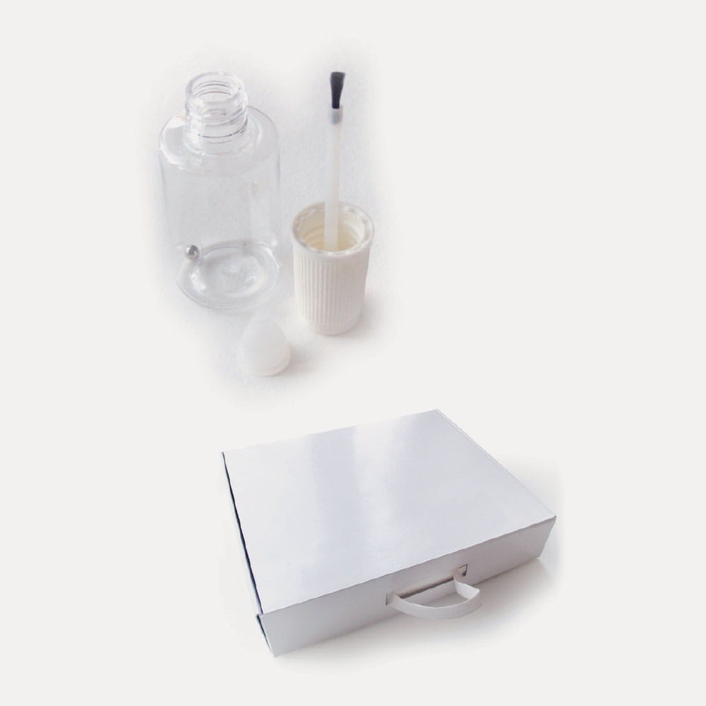 Z pędzelkiem, lejkiem do wycierania, etykietą, lejkiem do napełniania i kulką do mieszania