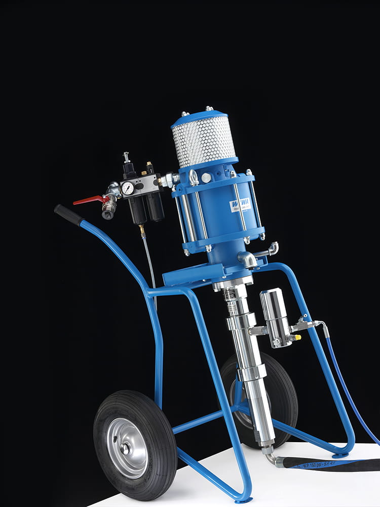 Ein besonders umfangreiches Geräteprogramm. Industrielle Beschichtungsarbeiten jeglicher Art können hiermit geleistet werden. Aufgrund ihrer hohen Druckübersetzung eignen sich die Modelle 28064 und 24071 besonders für das Verarbeiten von hochviskosen, lösungsmittelarmen und lösungsmittelfreien Materialien mit hohem Feststoffanteil. Optimal für längere Materialschläuche, größere Düsenbohrungen und hohe Spritzdrücke.